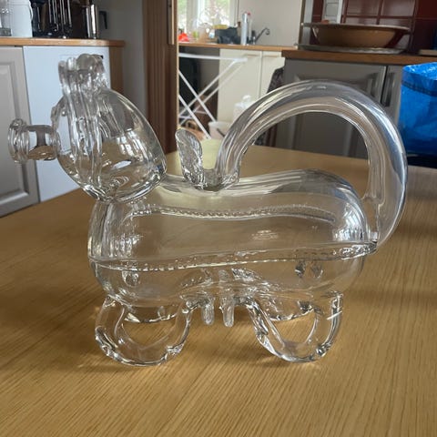 Lasinen eläinhahmo, joka toimii koriste-esineenä. Kirkasta lasia, muotoiltu eläimen näköiseksi. Sopii sisustuselementiksi hyllylle, lipastolle tai muuhun esillepanoon. Koriste-esine on ontto ja seisoo tasaisella alustalla.