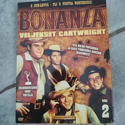 Bonanza Veljekset Cartwright DVD Vol 1. Lännenaiheinen televisiosarja, joka sijoittuu Ponderosa-ranchille. Levy sisältää ensimmäisen tuotantokauden jaksoja, joissa seurataan Cartwrightin perheen elämää ja seikkailuja. Kieli ja tekstitys suomalaisen julkaisun mukaisesti, ikäraja 11. Sopii DVD-soittimille, jotka tukevat aluekoodia 2 (Eurooppa).