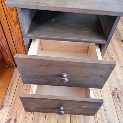 Pääosin maalattua puuta. Kiskot muovia. Ryhdikäs/tukeva. Käytön jälkiä on lievästi