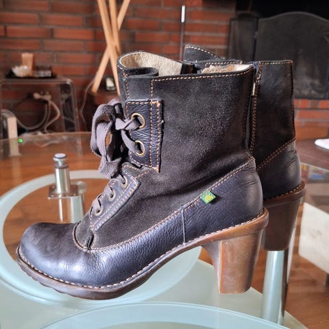 Tummanruskeat, juuri mehiläisvahalla käsitellyt laadukkaat kengät. Pohjat kumia, tosi mukavat jalassa. Varsiosassa kankaassa hieman nyppyä, lähtee kyllä pois jos jaksaa poistaa. Vartta voi pitää ylhäällä tai käännettynä alas. Merkki on El Naturalista.