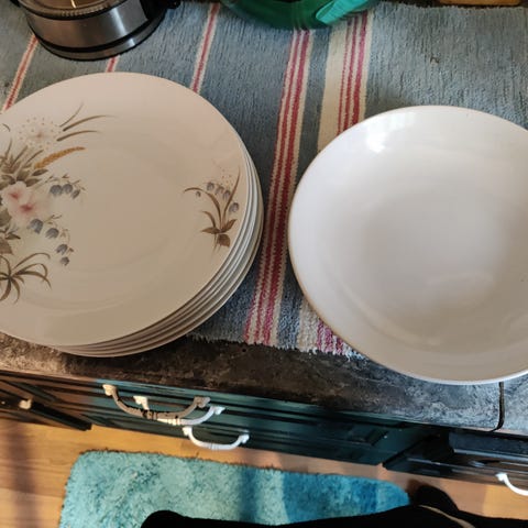 Bohemia 6kpllautasta halkaisija17cm joissa vaalea pohjaväri ja monivärinen kukkakuvio. Reunassa on kultainen koristelista. Materiaalina posliini, pohjassa Bohemia merkintä ja valmistusmaa Tšekkoslovakia. Sopivat esimerkiksi kattaukseen ruoka- tai jälkiruokalautasiksi.