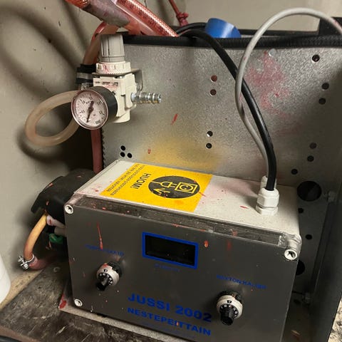 ABAC Montecarlo ilmakompressori. Moottoriteho 1,1 kW (1,5 HP) ja käyttöjännite 230–240 V / 50 Hz. Kierrosluku 2850 r/min. Kompressorissa on painemittari, paineensäädin ja pikaliitin paineilmatyökaluille. Runko on teräksinen ja säiliö on vaakamallinen. Soveltuu yleisiin paineilmatöihin, kuten renkaiden täyttöön ja kevyisiin paineilmatyökaluihin. Vuosimalli 1998 näkyy tyyppikilvessä.