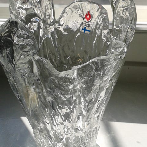 Myydään ehyt kirkas lasinen maljakko. kork. 35 cm,halk.14 cm. Nouto
