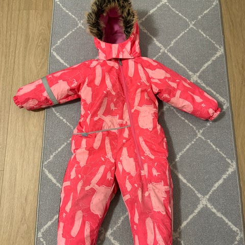 Lassie toppapuku, ei enää uuden muhkea mutta hyvä ja ehjä puku. En näe haalistunut. Ehkä toisessa polvessa pieni kohta. Kaunis ja hyvä puku vielä seuraavalle.