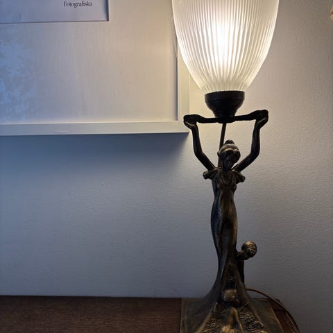 Koboltinsininen lasinen pöytävalaisin St-stanssilla (Stockmannin valaisintukku?) ehkä 60-luvulta, jossa puinen varjostin josta valo sirottuu kivasti. Lasi on ehjä, sisällä hieman samentumaa. Lasissa kulkee tuollainen kuviointi sisällä, näkyy parhaiten 4. kuvassa. Messinkikannassa on lommo ja valkoisessa posliiniosassa halkeama, joka myöhemmin liimattu, näkyy viimeisessä kuvassa. Varjostimessa on kulumaa.