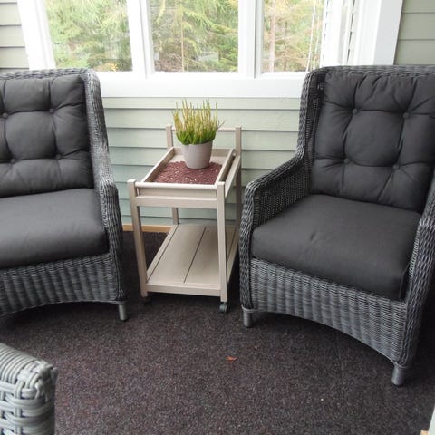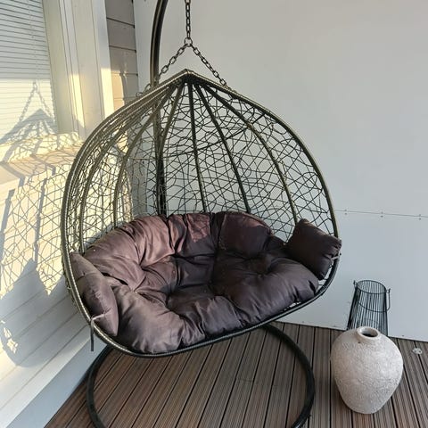 Riippuva kahden istuttava korituoli, jossa tummanharmaa runko ja vaaleanharmaa istuinpehmuste. Tuoli on pisaranmuotoinen ja valmistettu punotusta materiaalista metallirungolla. Sopii esimerkiksi parvekkeelle, terassille tai sisätiloihin rentoutumistuoliksi. Istuinosa on pehmustettu, ja selkänoja sekä sivut antavat tukea istuma-asennolle.