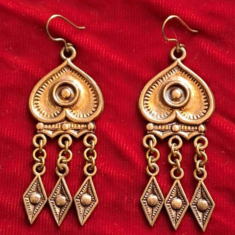 Pronssi korvakorut koukuilla, korkeus koukkuineen 3cm. Rasia ja tarinalappu kuuluu kauppaan.