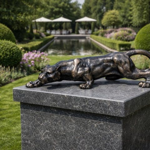 Kyseessä on erittäin yksityiskohtaisesti valettu rautainen patsas, joka esittää piileskelevää pantteria. Se on erittäin hyvässä kunnossa ja sen mitat ovat (noin):Korkeus: 14 cmLeveys: 42 cmKaikki tuotteemme pakataan huolellisesti ja lähetetään vakuutettuna.