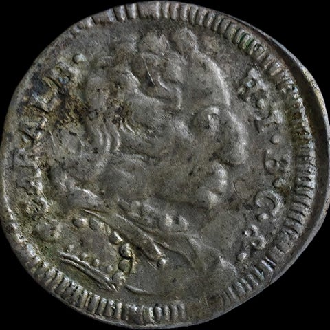 Preussilainen kolikko vuodelta 1755, Königsbergin Friedrich II:n rahapajan leima E hopeaa 2,5 grammaa. Friedrich Suuri Friedrich II, "Vanha Fritz", Preussin kuningas 1740-1786, Preussin-Saksan valtion perustaja