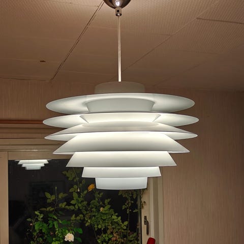 Valaisimen pienemmän kuvun reikien kohdalla pienet vauriot. Yleisvaikutelma hyvä.