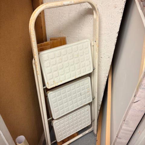 Porrasta on käytetty, ja siinä on havaittavissa maaliroiskeita ja kulumaa.