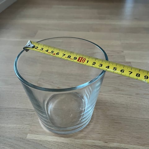Käytetty punainen lasinen koriste-esine. Pieni, pyöreäpohjainen esine, jossa on kapeampi kaula ja aaltoileva reuna yläosassa. Valmistettu lasimaalauksesta. Sopii esimerkiksi pöytäkoristeeksi tai pienten kukkien tai oksien asetteluun. Kuvissa esineen muoto ja kunto näkyvät tarkemmin.