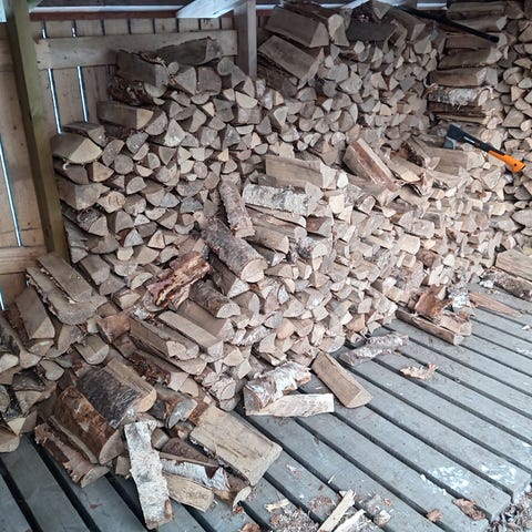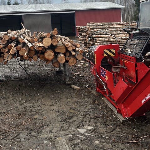 Vaihtolavallinen koivuklapia, sisältää noin 10% muita puulajeja. Määrä 14 heittomottia, pilkottu kesällä 2025.