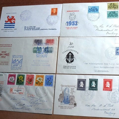 Alankomaat 1953/1954 - 6 FDC:t (5x avoimella läpällä) 1950-luvulta - NVPH E13/E18 Luettelointiarvo €605,00 Katso liitetyt skannaukset lisätietoja varten. Lähetetään seurannalla.