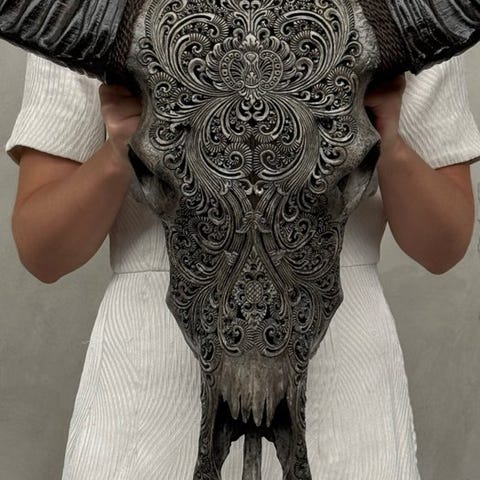 EI VÄHIMÄISHINTAA - C- Suuri käsin veistetty musta vesipuhvelin pääkallo -