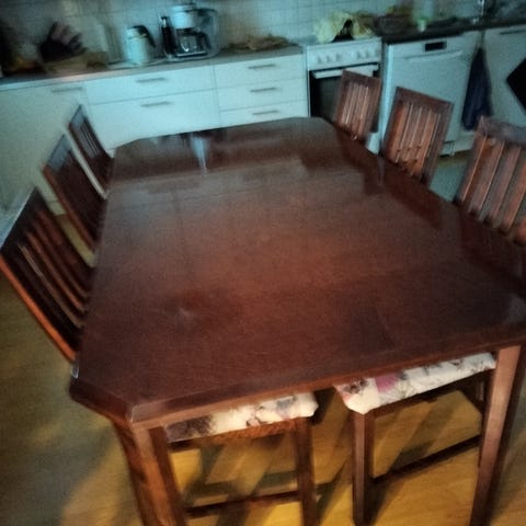 Myydään 90x150cm pöytä ja siihen 4 tuolia. Noutopäivä lauantai aamupäivänä sillä silloin muutto tulossa.