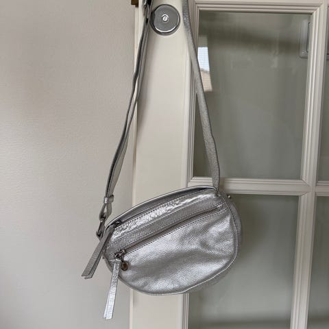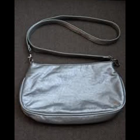 Hopean värinen, ehkä kerran käytetty pieni olka/käsilaukku