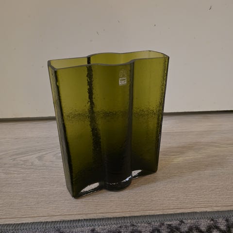 Lasinen vihreä maljakko.