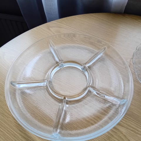 Lasinen jaettu tarjoiluvati, jossa on neljä erillistä lokeroa ja kohokuvioitu kasviaiheinen koristelu. Kahvat molemmissa päissä. Soveltuu esimerkiksi pikkusuolaisten, makeisten tai lisukkeiden tarjoiluun.