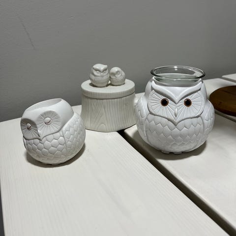 Partylite tuikkukanit. Nämä kokenu vähän enempi. Naarmuja. Pieni pupu ehkä vähän kellastunu? Mutta ei paljoa