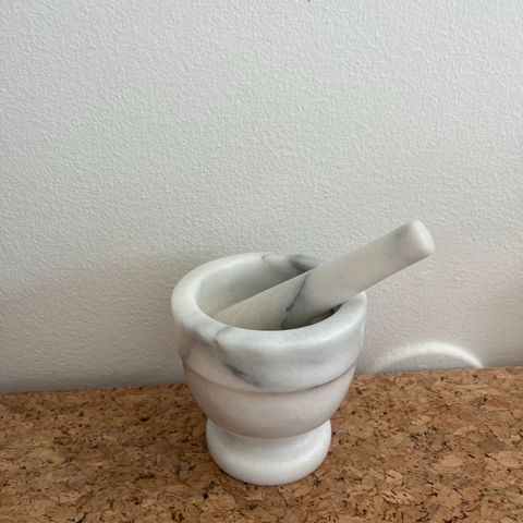 Mortteli ja survin, valmistettu marmorista. Yksinkertainen ja käytännöllinen muotoilu.