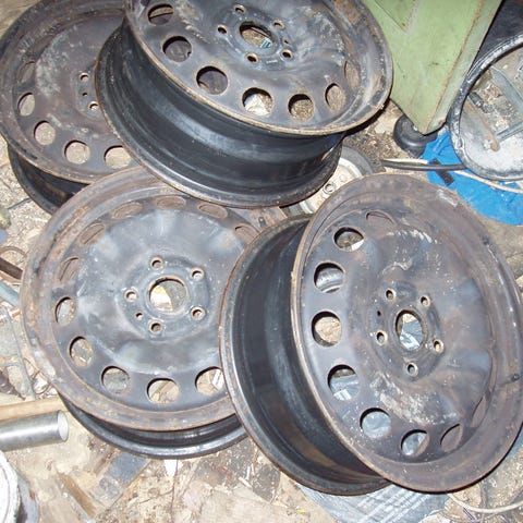 Tästä pari vw orkkis vanteita vaikka varalle. Molemmat suoria ja ei pilattu painoilla. Toisessa muutama naarmu, näkyy kuvassa, ei kolhittu reunoja.