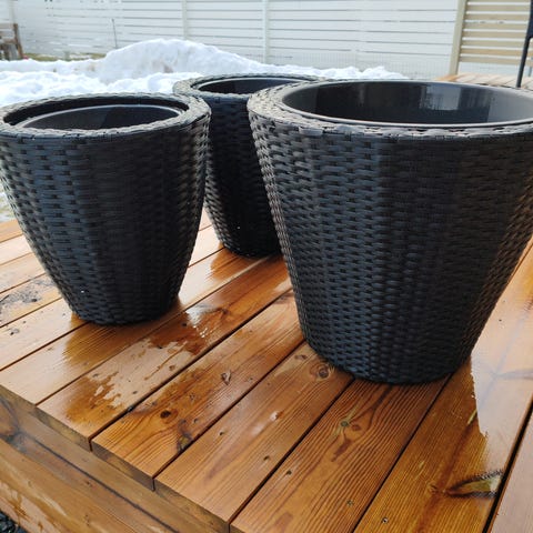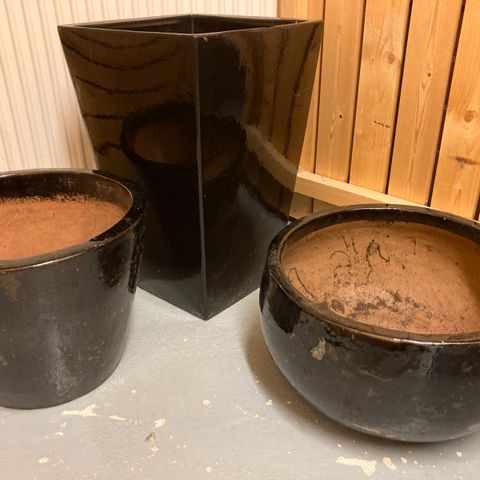 Painavat saviruukut koristekuviollisella reunuksella. Perinteinen terrakotan sävy, yläreunassa tummempi koristeellinen vyöhyke. Ruukut voidaan käyttää sellaisenaan tai sisäruukun kanssa. Korkeus 38 cm ja halkaisija 52 cm.