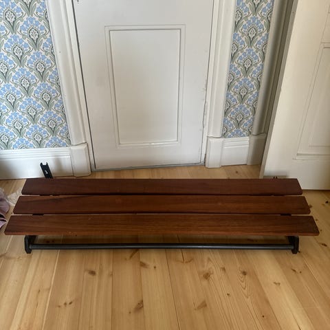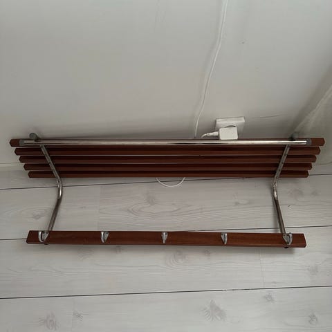 Puinen hattuhylly. Käytön jälkiä, mutta täysin ehjä. Nouto Hermannista.