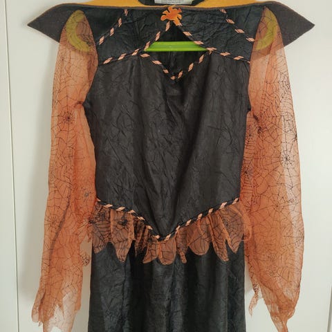 Musta noidan mekko jossa liilat samettihihat ja kaulukset. Huopainen hattu. Tästä kiva puku virpojalle pääsiäiseen. Sopii parhaiten n. 130cm lapselle, riippuu kuinka pitkä haluaa mekon olevan..myynnissä myös hämähäkki tyllihame pääsiäiseen.