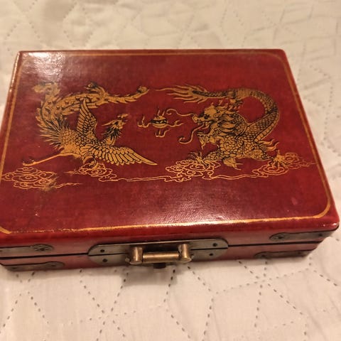 Kiinasta -90 luvun alussa tuotu rasia. Kangaspäällyste ja kolme lokeroa. Mitat: