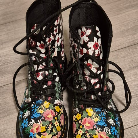 Paljon rakkautta saaneet Dr Martens Pascal kengät koossa 37. Rikkinäinen kengännauha korvattu keltaisella, joten nämä rokkaa eripari nauhoilla :-)