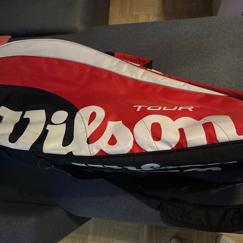 Väri musta, yksityiskohdissa valkoista ja keltaista. Laukussa on olkahihna kantamista varten ja se on muotoiltu suojaamaan tennismailoja kuljetuksen ja säilytyksen aikana.