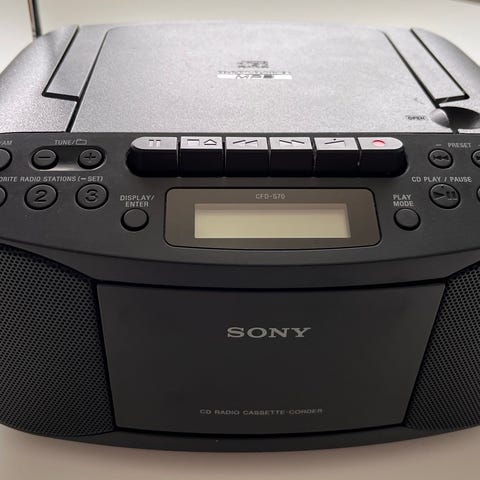 Sony CD-soitin ja radio. Laitteessa on CD-levyjen soitin yläkannessa, FM/AM-radio sekä digitaalinäyttö. Etupaneelissa on ohjauspainikkeet, esiasetuspainikkeet radiokanaville, USB-liitäntä ja Audio In -liitäntä ulkoiselle äänilähteelle. Sisäänrakennetut kaiuttimet sijaitsevat laitteen etupuolella. Kantokahva helpottaa laitteen siirtämistä. Väri on musta.