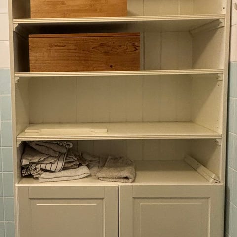 Annetaan pois 3-osainen kaappi, jossa lasiovet ylimmässä ovessa (k. 96 cm), kaksi laatikkoa keskimmäisessä osassa (k. 21,5cm) ja kolme leveää hyllyä alimmaisessa osassa (k. 74 cm