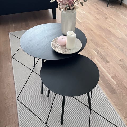 Myydään hyväkuntoinen Jyskin sohvapöytä. Pöytä ostettu uutena noin kolme vuotta sitten, ei muita käytön jälkiä kuin kuvissa näkyvät pari pientä jälkeä pöytälevyssä. Pöytälevyn halkaisija noin 75 cm ja pöydän korkeus 45 cm.