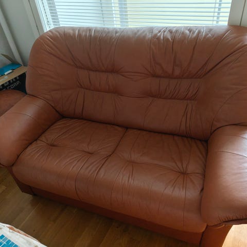 Lahjoitetaan kolmen istuttava nahkasohva. Rikkinäinen verhoilu, muuten hyväkuntoinen.