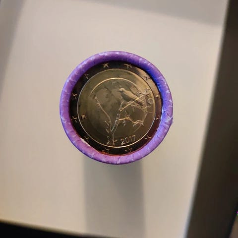 Suomen Pankin 2 euron kolikkorulla, jossa on 25 kappaletta 2 euron kolikoita (yhteensä 50 euroa). Kolikot ovat pankkirullassa, jonka päissä näkyvät 2 euron kolikot. Soveltuu esimerkiksi keräilyyn.