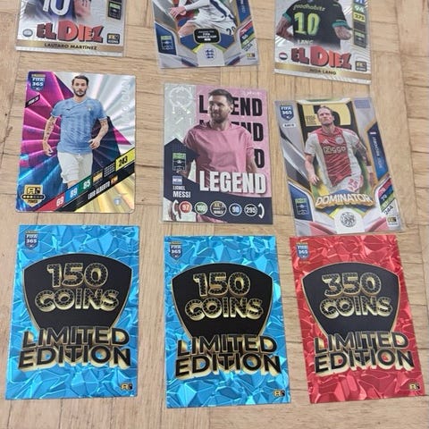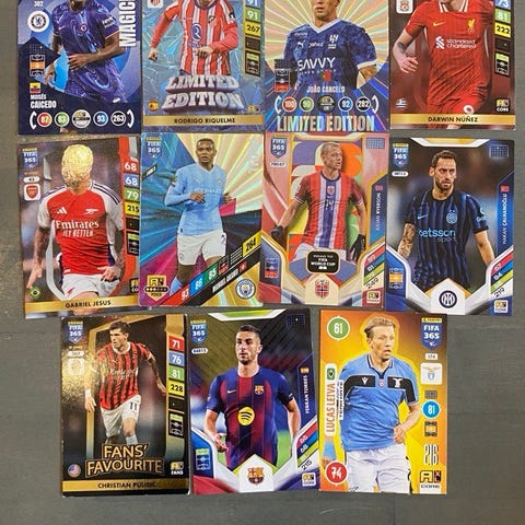 Panini FIFA 365 Adrenalyn XL jalkapallokeräilykortit. Settiin kuuluu useita erikois- ja peruskortteja eri joukkueista sekä pelaajista. Mukana on myös alkuperäinen säilytys-/myyntilaatikko sekä erillisiä suojataskuja korteille. Sopii kokoelmaan tai vaihtoihin jalkapallokorttiharrastajalle.