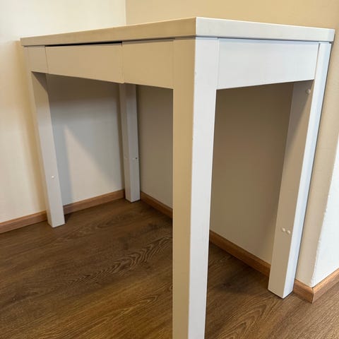 Ikean kevyt sivupöytä/työpöytä, kulumaa ja jälkeä löytyy jonkin verran mutta yleisilme siisti. Jalat ns. levittyvät, joten mitat lattiassa syvyys 44 cm, leveys 114 cm. Vain haku Kuopion keskustasta.