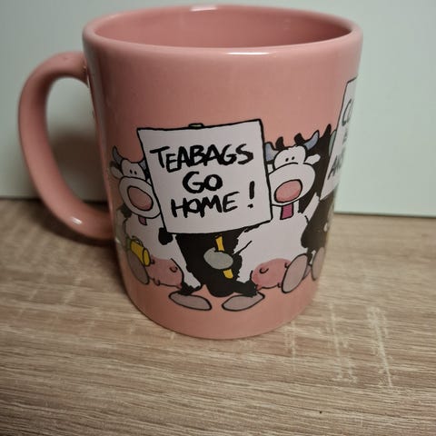 muki, jossa valkoinen pohjaväri ja painettuna piirrosmainen lehmähahmo sekä vihreitä apilakuvioita. Muki on keraaminen ja siinä on korva. Soveltuu esimerkiksi kuumille juomille, kuten kahville, teelle tai kaakaolle arki- ja vapaa-ajan käyttöön.