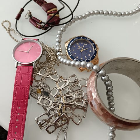 Ainoastaan kelloa on käytetty, nyt on paristo loppu. Muut korut jääneet käyttämättä.