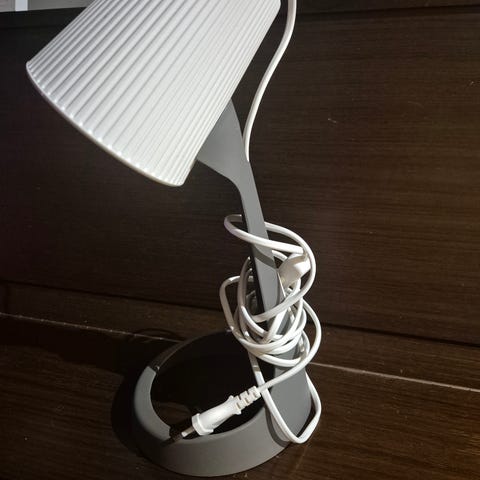 Pyöreä lasinen Ikean lamppu, menee niin pöytä- kuin lattiavalaisimena.