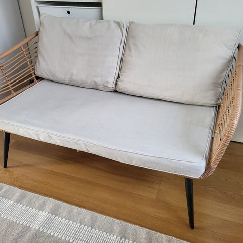 Myydään kuvan mukainen kokonaisuus. 2 tuolia, sohva ja pöytä. Rottinkia. Pöytä halkaisija 80cm, Sohva pituus 110, syvyys 60cm. Sohvan pehmusteessa pieni repeämä. Rottinkiset rungot hyvässä kunnosss. Hinta 70e. Käteismaksu. Vain nouto.