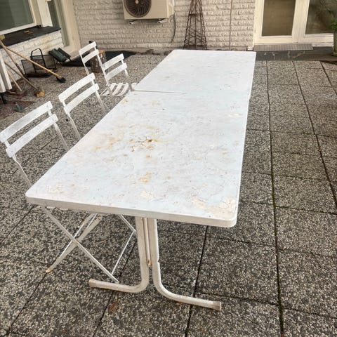 Annetaan kaksi pihatuolia. Toinen hieman rikki istuinosan kohdalta.