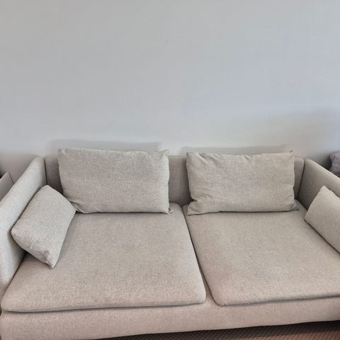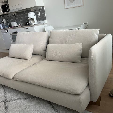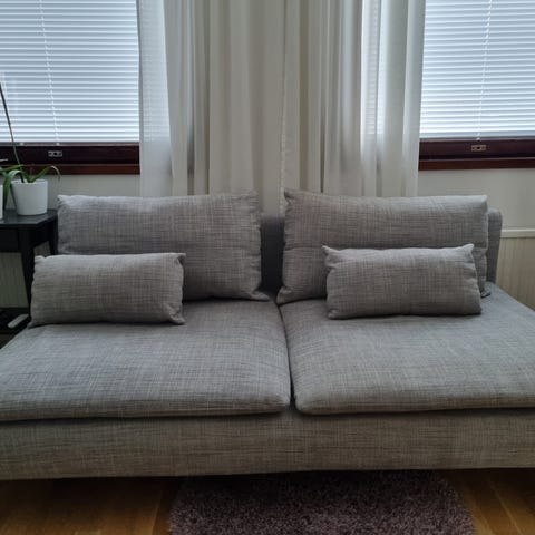 IKEAn Söderhamn moduulisohvan yksi osa. Runko hyvässä kunnossa. Päälisinä on jokin kermanvaalea kangas, joka ei näemmä kestä konepesua. Pesin pääliset koneessa ja jouduin korjailemaan niitä (ei näy päälle päin mitenkään ja täysin käyttökelpoiset edelleen, mutta toisten en koneeseen laittaisi). Tämä huomioitu hinnassa. Toisella sivulla kankaassa aukot käsinojaa varten. Erilaisia päälisiä myynnissä Ikeassa ja Toristakin löytyy, jos haluaa vaihtaa.