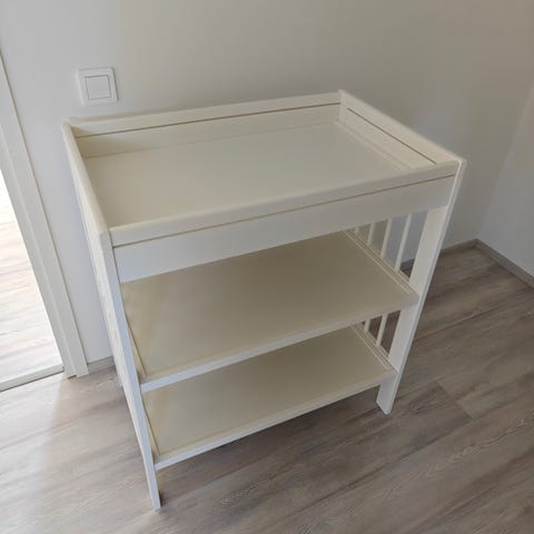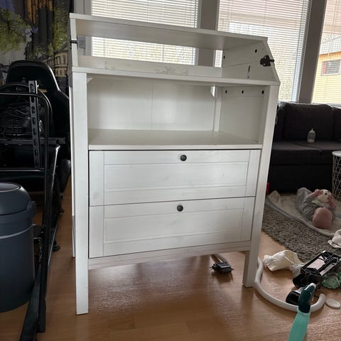 IKEA hoitopöytä lipasto mäntyä. Yläosassa korotetut reunat hoitoalustaa varten. Alla kaksi avointa hyllyä ja kaksi tilavaa vetolaatikkoa säilytykseen. Materiaalina lakattu mänty, väri luonnonpuu. Sopii lastenhuoneeseen vauvan hoitopisteeksi ja vaatteiden tai tarvikkeiden säilytykseen.