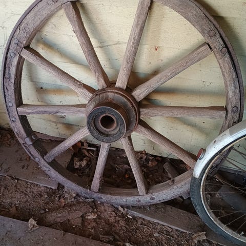 Vanha puoliympyrän mallinen pyöräteline. Pinta huonossa kunnossa, vaatinee käsittelyä.