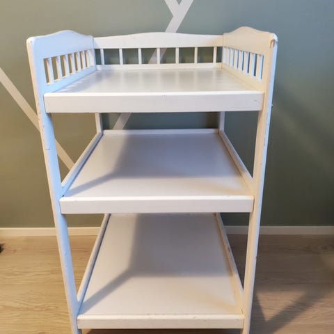 Valkoinen Jollyroomilta ostettu hoitopöytä. Käytön jälkiä ja pientä kolhua löytyy, mutta yleisilmeeltään edelleen oikein siisti.