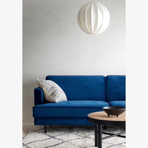 Kaunis sininen samettisohva, ostettu käytettynä alle vuosi sitten. Pehmeä ja mukava, tuo tyylikästä väriä kotiin. Myymme muuton takia.