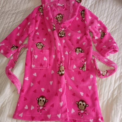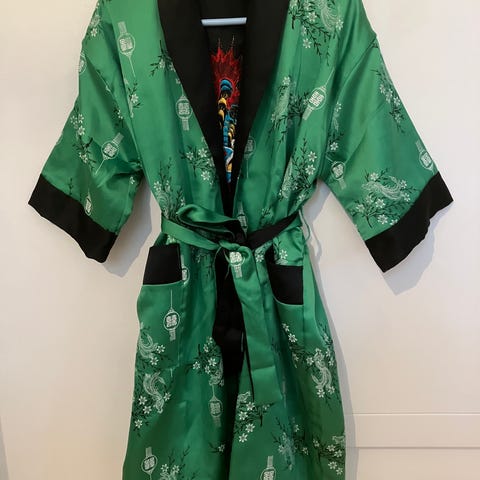Kimono-tyylinen kaksipuolinen aamutakki. Toisella puolella vihreä, kiiltävä pinta, kukka-lyhty- ja riikinkukkokuvioinnilla sekä taskut, joissa mustat reunukset. Toisella puolella musta kiiltävä pinta vihrein yksityiskohdin ja selkäpuolella kirjailtu värikäs lohikäärme. Vyötäröllä solmittava kaksipuolinen vyö ja lyhyet, leveät hihat. Takin pituus olasta helmaan 78 cm.